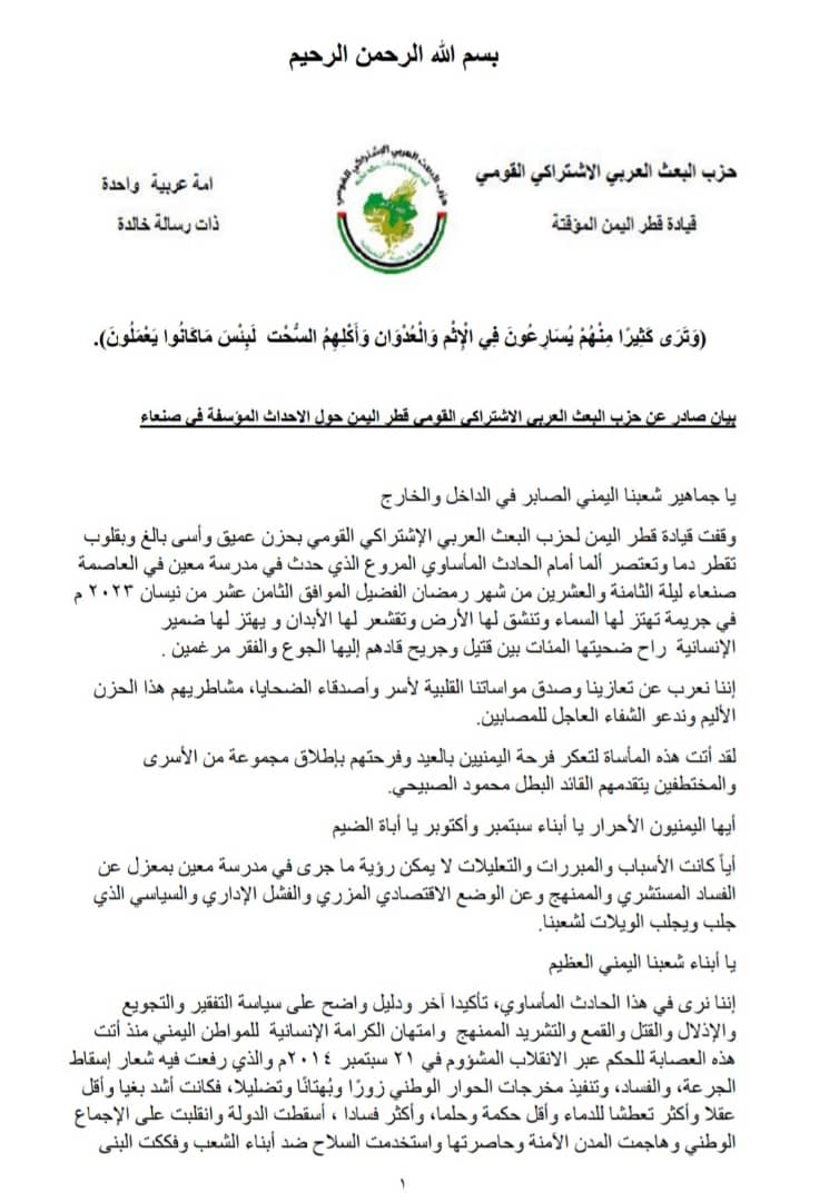 وقفت قيادة قطر اليمن لحزب البعث العربي الإشتراكي القومي بحزن عميق وأسى بالغ وبقلوب تقطر دما وتعتصر ألما أمام الحادث المأساوي المروع الذي حدث في مدرسة معين في العاصمة صنعاء ليلة الثامنة والعشرين من شهر رمضان الفضيل الموافق الثامن عشر من نيسان 2023 م في جريمة تهتز لها السماء وتنشق لها الأرض وتقشعر لها الأبدان و يهتز لها ضمير الإنسانية راح ضحيتها المئات بين قتيل وجريح قادهم إليها الجوع والفقر مرغمين.