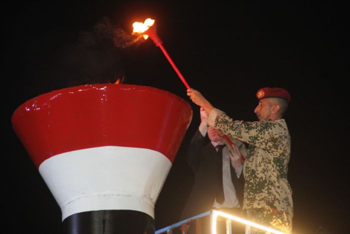 وأوقد الشعلة كلٌّ من: وكيل محافظة تعز رشاد الأكحلي، ورئيس عمليات المقاومة الوطنية اللواء الركن عبد الرحمن نعمان.