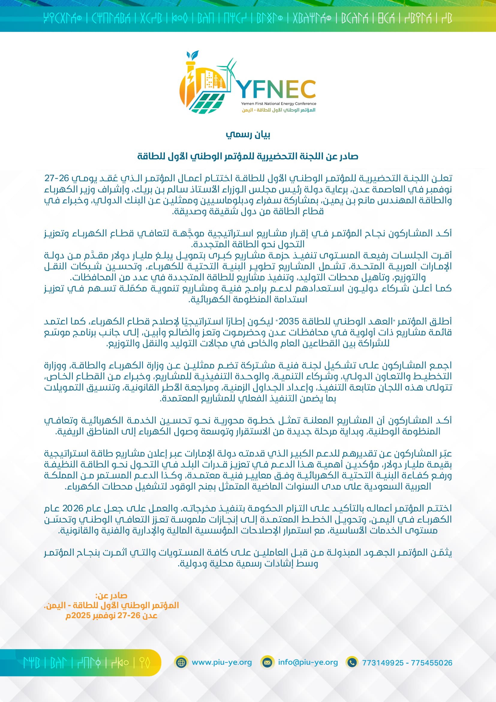 تعلن اللجنة التحضيرية للمؤتمر الوطني الأول للطاقة اختتام أعمال المؤتمر الذي عُقد يومي 26-27 نوفمبر في العاصمة عدن، برعاية دولة رئيس مجلس الوزراء الأستاذ سالم بن بريك، وإشراف وزير الكهرباء والطاقة المهندس مانع بن يمين، بمشاركة سفراء ودبلوماسيين وممثلين عن البنك الدولي، وخبراء في قطاع الطاقة من دول شقيقة وصديقة.