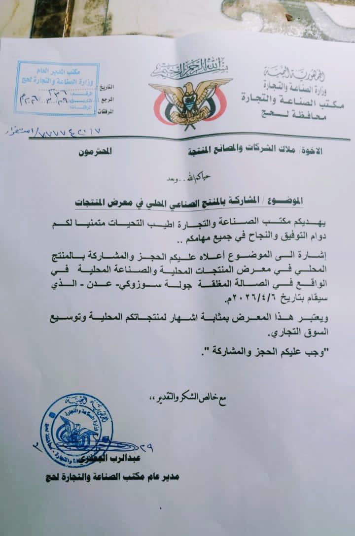 وأشار المدير العام لمكتب الصناعة والتجارة بالمحافظة، الأستاذ عبدالرب الجعفري، في تعميم رسمي، إلى أن المعرض سيقام في “الصالة المغلقة” الواقعة بجولة سوزوكي بمديرية الشيخ عثمان، ابتداءً من تاريخ 6 أبريل 2026م، مؤكداً أن هذا الحدث يمثل منصة حيوية لإبراز القدرات الإنتاجية التي تتمتع بها المنشآت الصناعية في محافظة لحج.